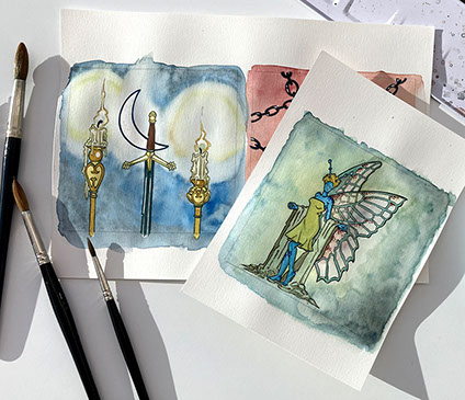 Le jeu de cartes « Les emblèmes » se compose de 45 cartes illustrées représentant des images originales pouvant servir d’emblèmes, de blasons, de pavillons ou de symboles dans vos histoires. Ce jeu vous permettra d’intégrer une héraldique spécifique à vos univers. Chaque illustration de ce jeu a été réalisée à l’aquarelle et parfois à l’encre de chine.
